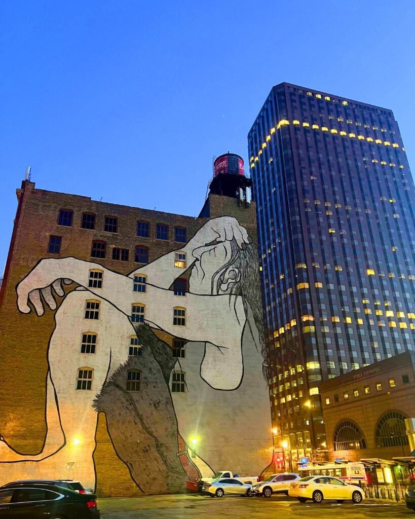 “Native American Lost in Chicago… Dreamin’” is one of those murals you feel before you even process it. It’s massive – a quiet, almost sleepy figure stretched across the side of a building, like they’ve drifted off right in the middle of the Loop.
