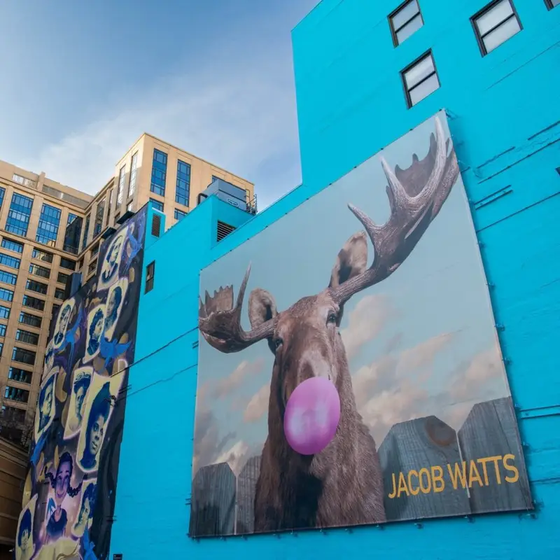 The Moose Bubblegum Bubble mural is pure Chicago weird in the best way — a giant moose, dead serious, casually blowing a bright pink bubble like it’s the most normal thing in the world.