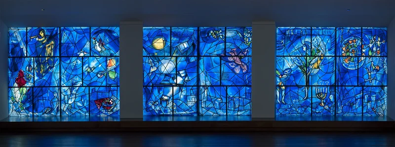 Three monumental panels of stained glass, each more than eight feet tall, together stretching over thirty feet across. Deep cobalt blue is the dominant colour. Floating through the glass are musicians, dancers, painters, the Statue of Liberty, the Chicago skyline, and a menagerie of figures from American and Jewish history. Marc Chagall designed these windows in 1976 and gave them to the Art Institute as a gift in 1977 to celebrate the American Bicentennial.